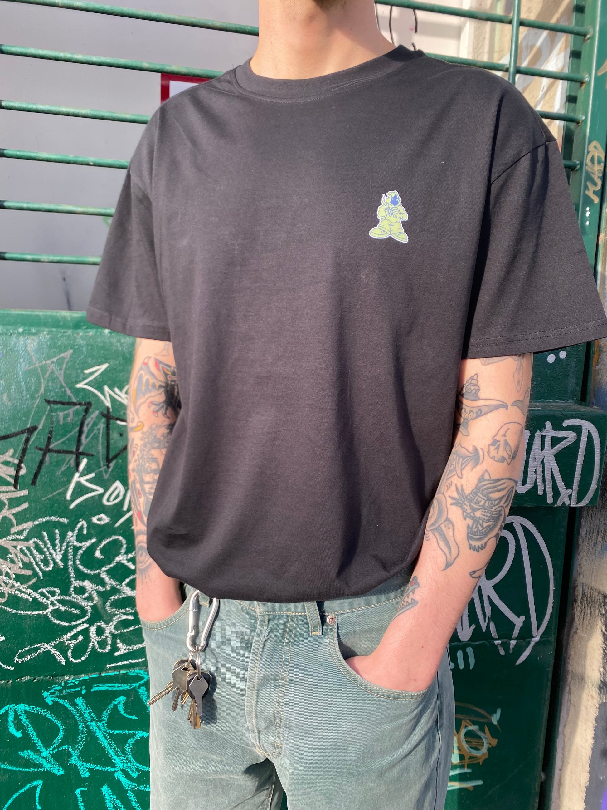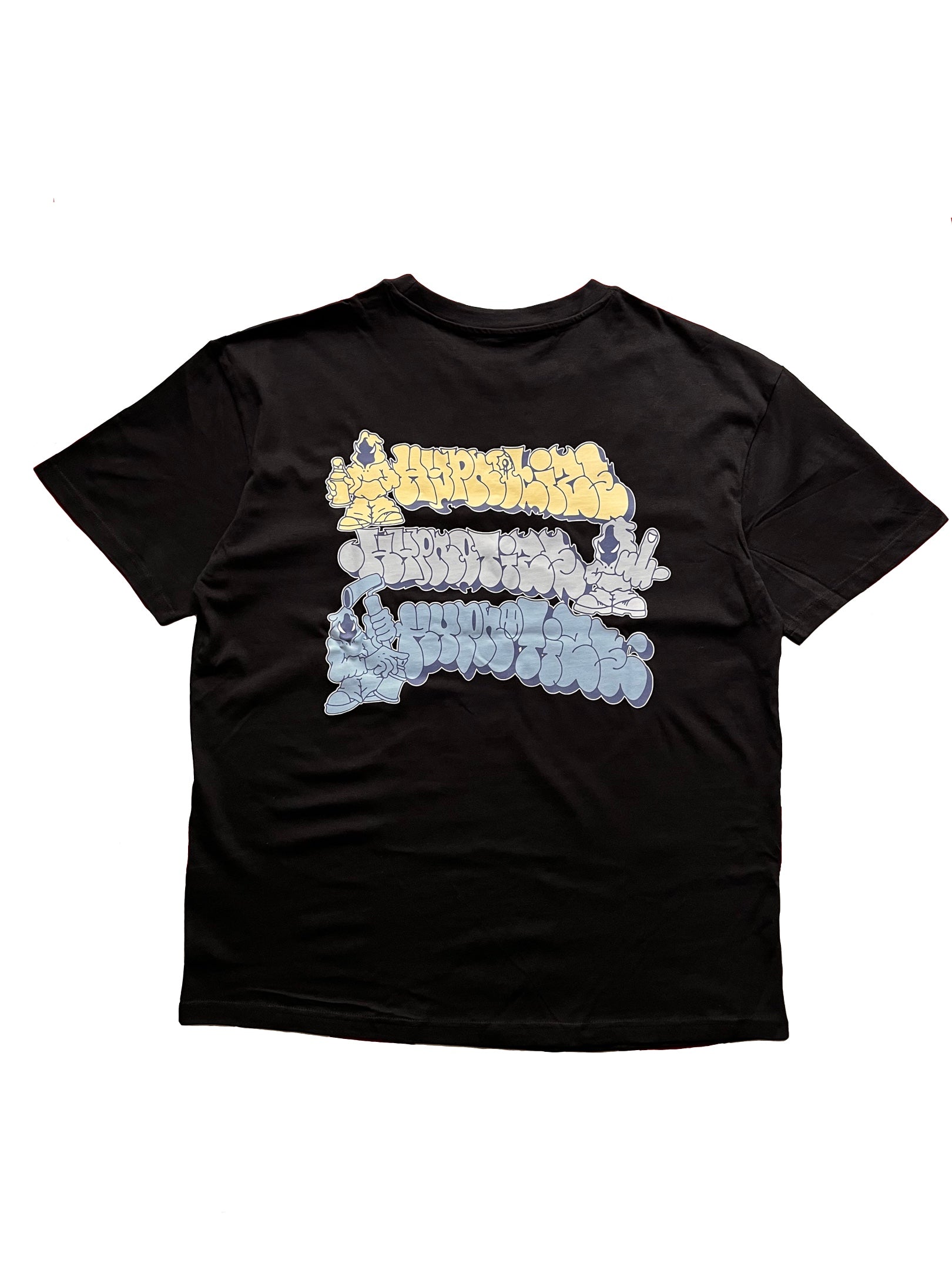 Schwarzes Shirt mit drei funky „Hypnotize“-T-Ups auf dem Rücken und einem Smokey-Character auf der Brust.